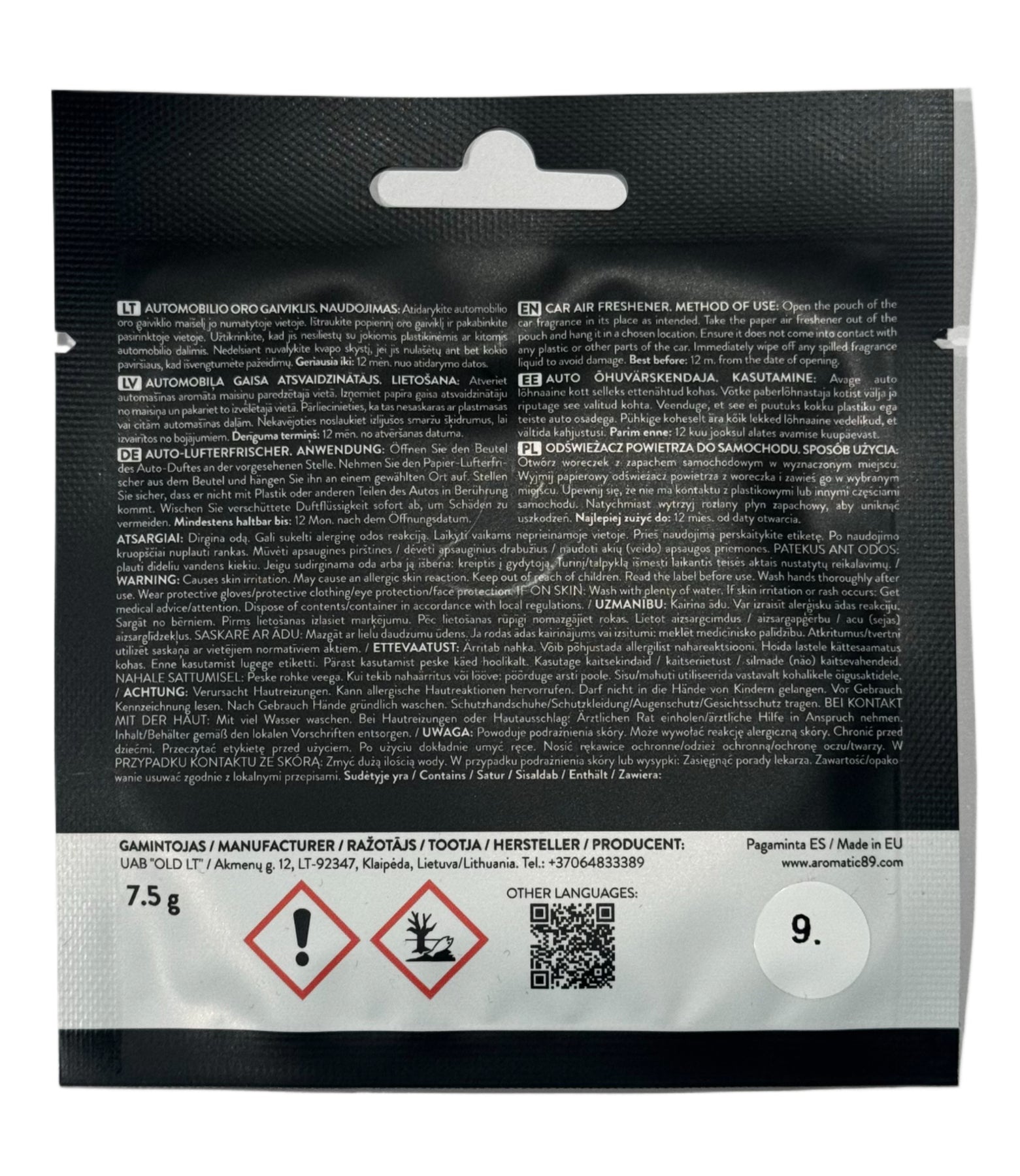 Naudojimas: Atidarykite automobilio oro gaiviklio maišelį jo numatytoje vietoje. Užtikrinkite, kad jis nesiliestų su jokiomis plastikinėmis ar kitomis automobilio dalimis. Nedelsiant nuvalykite kvapo skystį, jei jis nulašėtų ant bet kokio paviršiaus, kad išvengtumėte pažeidimų.
